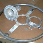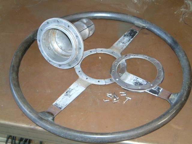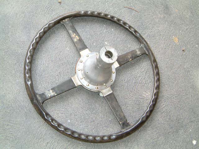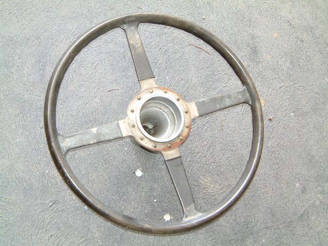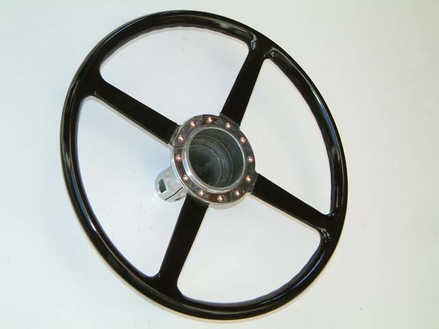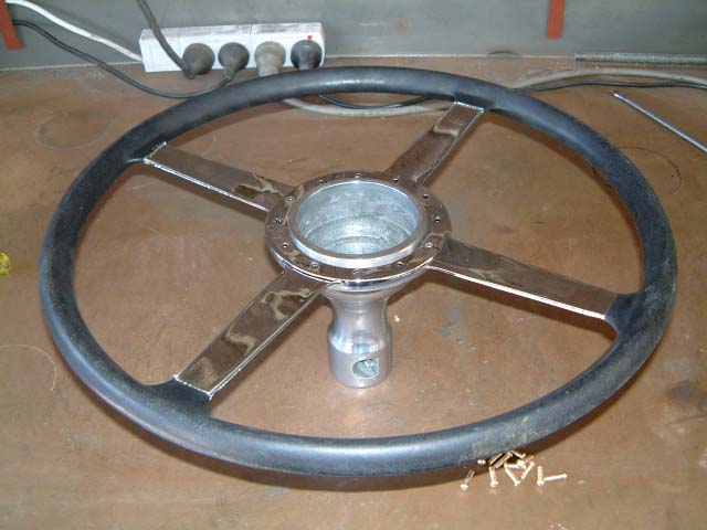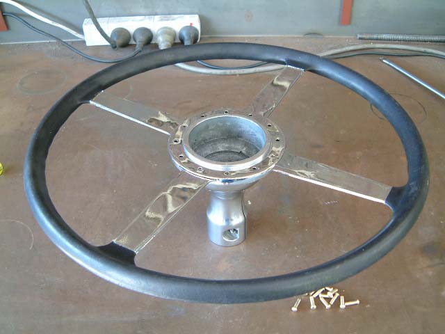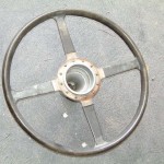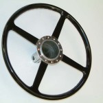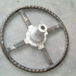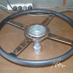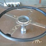 The steering wheel repairs of this classic involved stripping, re-chroming and polishing. We attached hand-made rivets and used an authentic type black plastic coating.