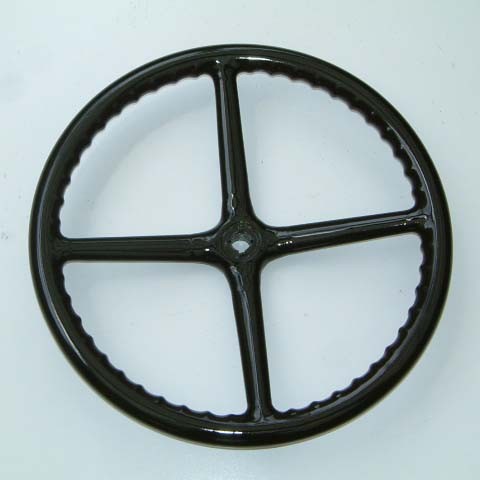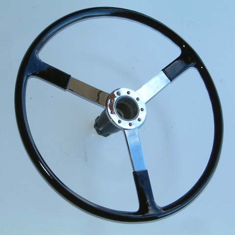 Classic steering wheel with some major damage to hub. Wheel required extensive repairs and re-forming. Plasticised in gloss black.See more