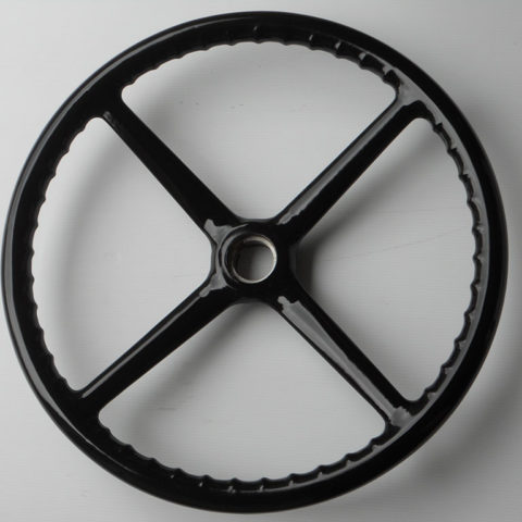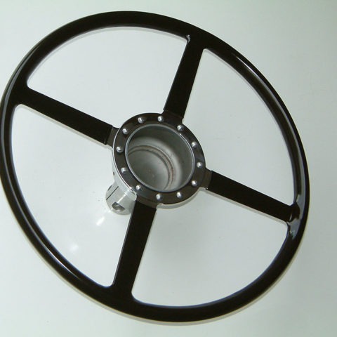 This vintage steering wheel came to us with much of the centre hub missing. We carried out major repairs and hand plasticised in black.See more